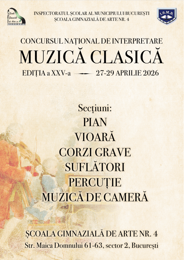 Avem deosebita plăcere de a vă aduce la cunoștință organizarea Concursului National de Interpretare „Muzică Clasică” ediția a XXV-a. Acesta va avea loc în perioada 27-29 aprilie 2026. Acesta este adresat atât elevilor care provin din cadrul instituțiilor de învățământ vocațional de stat cât și celor ce studiază în sistem privat.